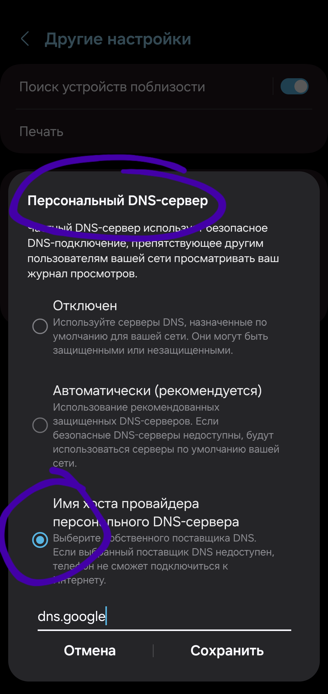 Всё чаще приходят жалобы на перехват DNS. Чтобы определить, какой DNS-сервер вы используете, откройте этот сайт. Для обеспечения корректной работы ByeByeDPI авторы данного руководства рекомендуют настроить DNS over TLS на уровне всей системы (стоит отметить, что такая возможность есть только на устройствах под управлением Android 9+).