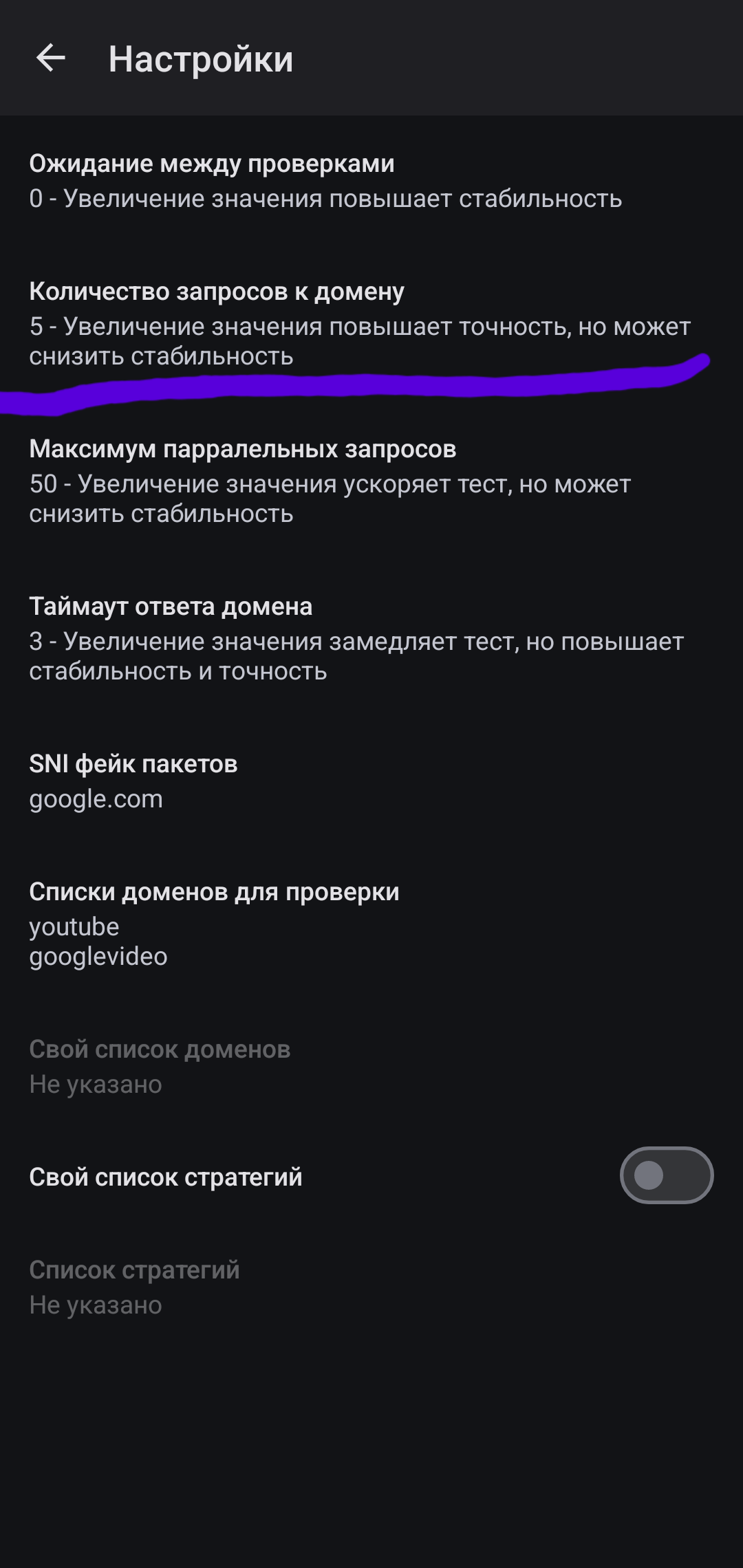 Если в подборе стратегий не нашлось стратегии, которая бы давала доступ к вашему сервису, рассмотрите возможность подбора пользовательских стратегий. Стратегии для него можно взять в Telegram-группе ByeByeDPI, или в других местах интернета.