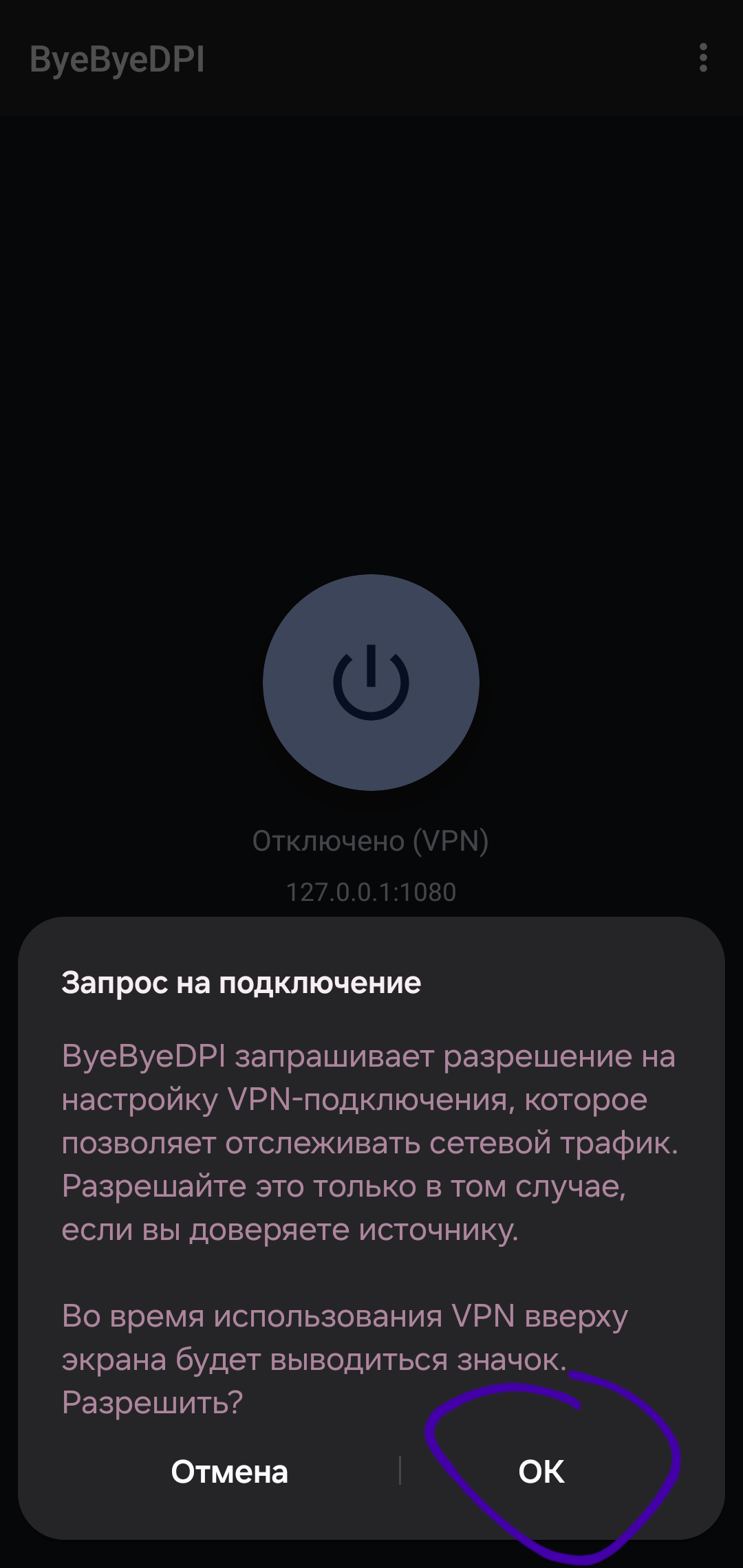 Выйдите из настроек и подключитесь, нажав на большую кнопку посередине экрана. Выдайте разрешение на поднятие VPN-соединения - это нужно для работы приложения.
