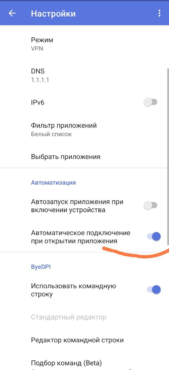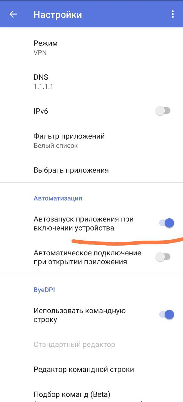 Автоматически запускает ByeByeDPI при открытии приложения (самого ByeByeDPI).