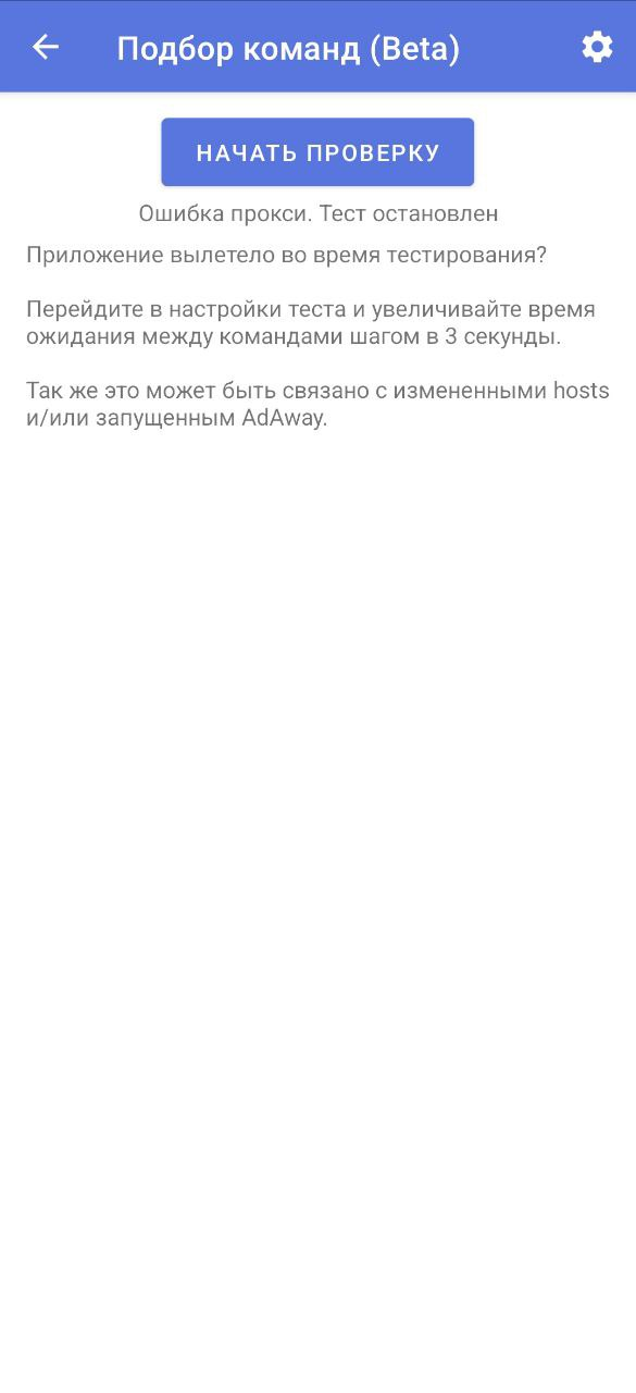Остановите приложение, очистите его данные и перезагрузите устройство. Можно попробовать сменить порт, например, на 1082. Если ничего не помогло - попробуйте очистить все данные ByeByeDPI, удалить приложение и поставить его заново. Увеличивайте таймауты в настройках подбора стратегий.