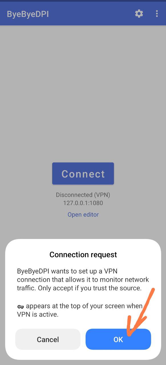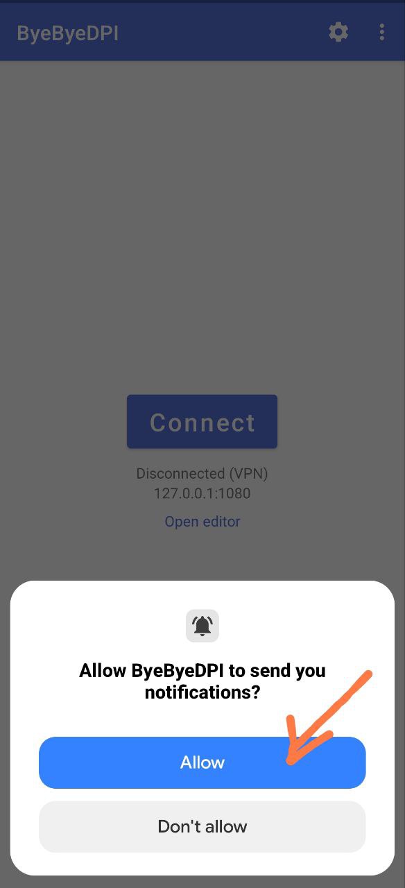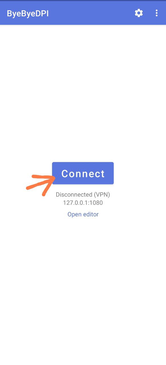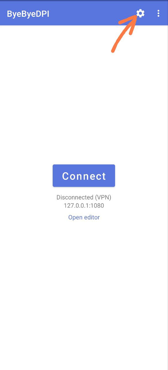 Before clicking Connect, go to the main settings in ByeByeDPI (the gear icon in the top right).